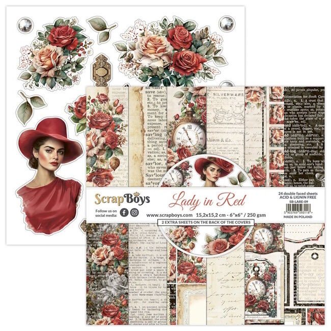 24 kaksipuolisen sivun sarja korkealaatuista scrapbooking-paperia. Jokainen sivu on kooltaan 15,25x15,25 cm (6x6 tuumaa). Setti sisältää 4x6 kuvioita + 2x kuvioarkki kansien käänröpuolella. Paperi painaa 250g/m2.