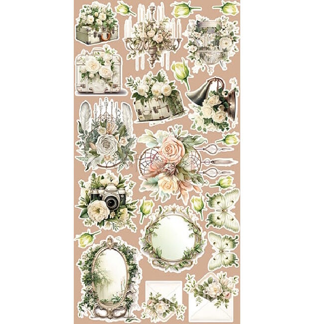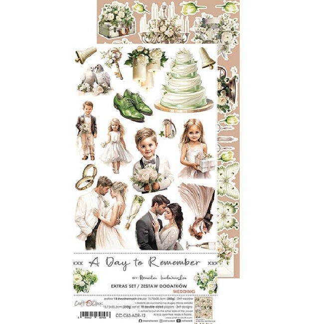 18 kaksipuolisen sivun sarja korkealaatuista scrapbooking-paperia lisäelementeillä - 2x9 kuvioita. Plus-arkki kannen sisäpuolella.