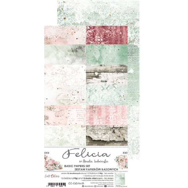 18 kaksipuolisen sivun sarja korkealaatuista scrapbooking-paperia lisäelementeillä - 3x6 kuvioita. Plus-arkki kannen sisäpuolella.