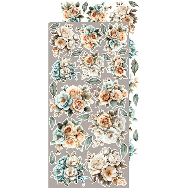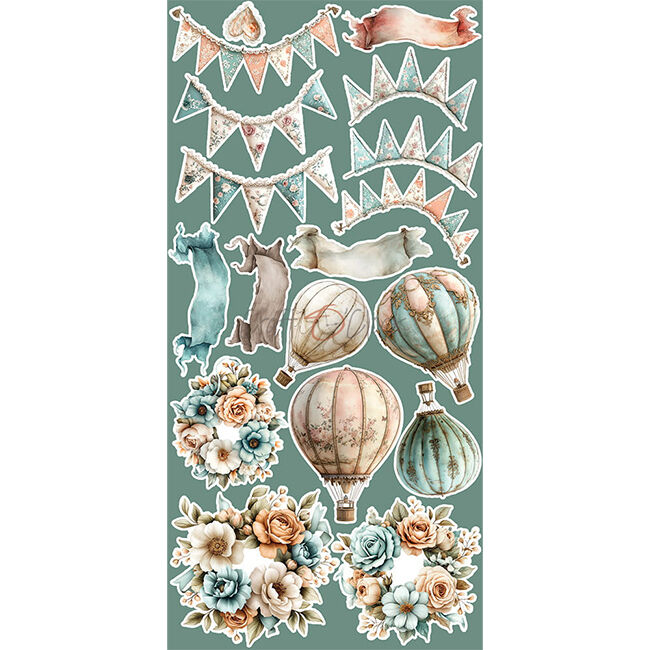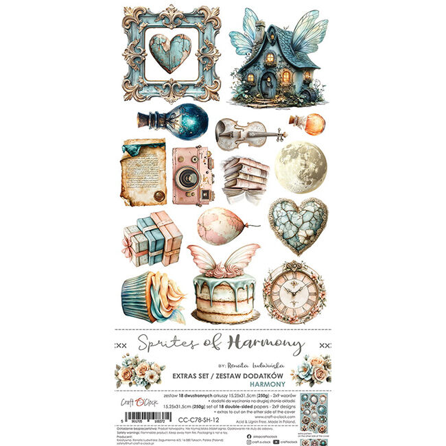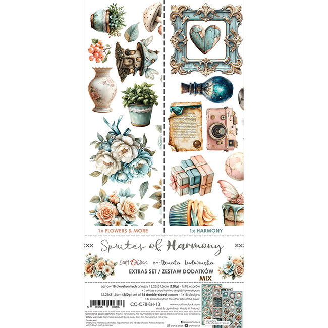 18 kaksipuolista sivua korkealaatuista scrapbooking-paperia, jossa on lisäleikattavia elementtejä (1x18 kuviota) + 3 arkkia, joissa on LISÄLEIKATTAVIA elementtejä kannen toisella puolella. Jokainen sivu on kooltaan 15,25x31,5 cm. Paperin paino on 250 g/m2.