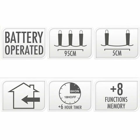 Lämpimän valkoinen hopealanka valosarja jossa 20 lediä 5 cm välein. Valosarja toimii paristoilla (3xAA 1,5V)(ei sisälly pakkaukseen), ja soveltuu sisäkäyttöön. Valo-osuuden pituus on 95 cm. Valosarjassa on ajastin (6 h päällä, 18 h kiinni), ja kahdeksan erilaista valotoimintoa.