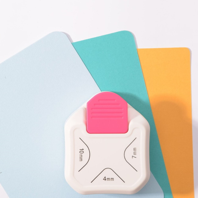 Pyöristä käyntikorttien, kutsujen, valokuvien, korttien, leikekirjan sivujen ja muiden paperityöprojektien kulmat kauniin viimeistelyn saamiseksi. Kulmanpyöristäjä on helppokäyttöinen ja se leikkaa tarkat, pyöristetyt kulmat. Liu'uta paperin kulma rei'itykseen, kunnes se koskettaa reunoja, ja paina painiketta alas. Näin saat kauniisti pyöristetyn kulman. Kulmanrei'itin sopii 120 gsm:n ja enintään 180 gsm:n painoisille papereille. Haluatko rei'ittää ohuempaa paperia? Käytä silloin paksumpaa paperia, esimerkiksi 160 gsm, ohuen paperin kanssa parhaan tuloksen saavuttamiseksi.