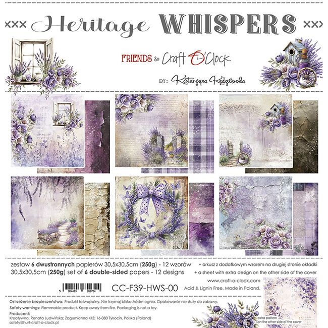 Setti 6 kaksipuolista arkkia (12 kuviota) korkealaatuista scrapbooking-paperia. Jokainen arkki on kooltaan 30,5 x 30,5 cm (12x12 tuumaa) sekä kaistale, jossa on nimi. Lisäksi jokainen sarja sisältää 1x arkin extrakuvion kannen sisäpuolella.