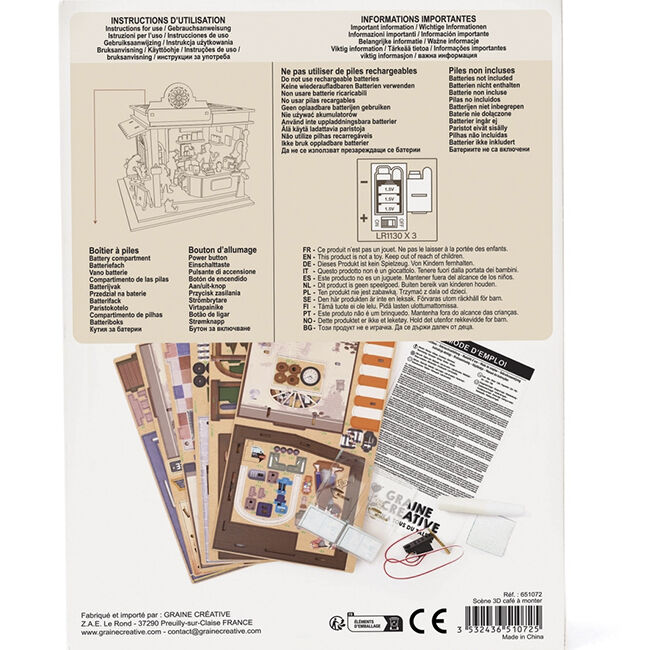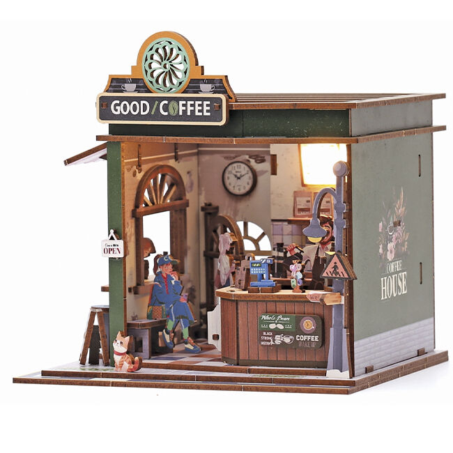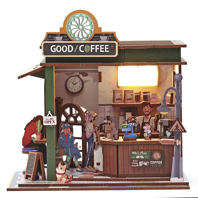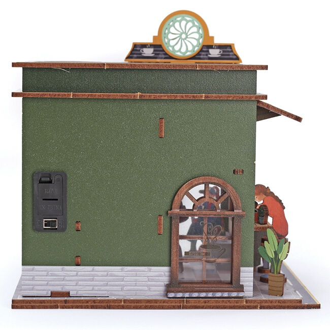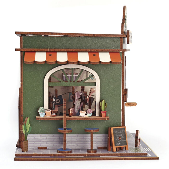 Tämä 3D-puinen kahvilamallisarja on luova miniatyyriprojekti, jonka avulla voit luoda tunnelmallisen kahvimaiseman. Malli koostuu tarkasti leikatuista puuosista, jotka kootaan askel askeleelta koristeelliseksi kokonaisuudeksi. Lopputuloksena on tyylikäs, koristeellinen malli, joka luo viihtyisän tunnelman.