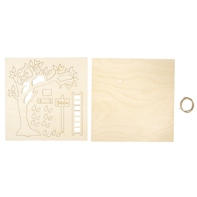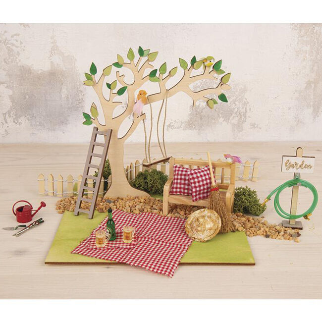 Luo oma miniatyyripuutarhasi! Tämä viehättävä 3D-puutarha, jossa on puu, tikkaat, kyltti ja keinu, on tehty 22 puuosasta. Luonnonpuuta voidaan maalata ja koristella haluamallasi tavalla.