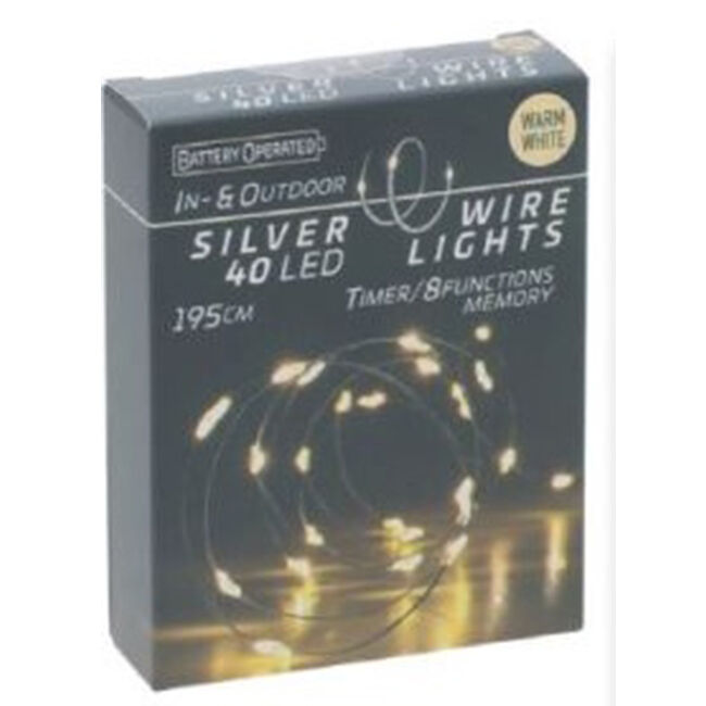 Lämpimän valkoinen hopealanka valosarja jossa 40 lediä 5 cm välein. Valosarja toimii paristoilla (3xAA 1,5V)(ei sisälly pakkaukseen), ja soveltuu sekä sisä- että ulkokäyttöön. Valo-osuuden pituus on 1,95 metriä. Valosarjassa on ajastin (6 h päällä, 18 h kiinni), ja kahdeksan erilaista valotoimintoa.