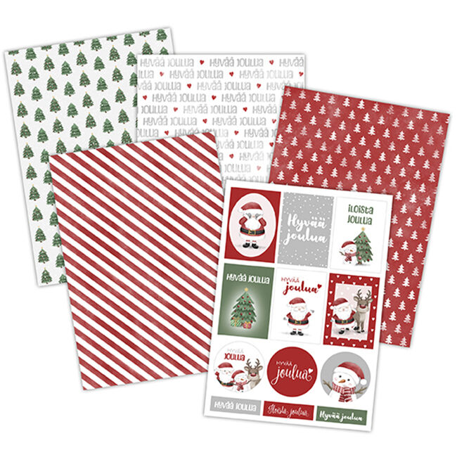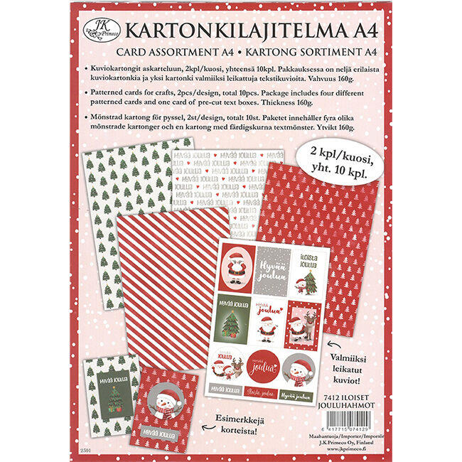 Kartonkilajitelma askarteluun ja koristeluun. Pakkaus sisältää kahdeksan arkkia A4-kokoisia kuviokartonkeja sekä kaksi A4-kokoista arkkia valmiiksi leikattuja kartonkisia tekstikuvioita. Pakkauksessa on neljä erilaista kuviokartonkia, kaksi kappaletta per kuosi.