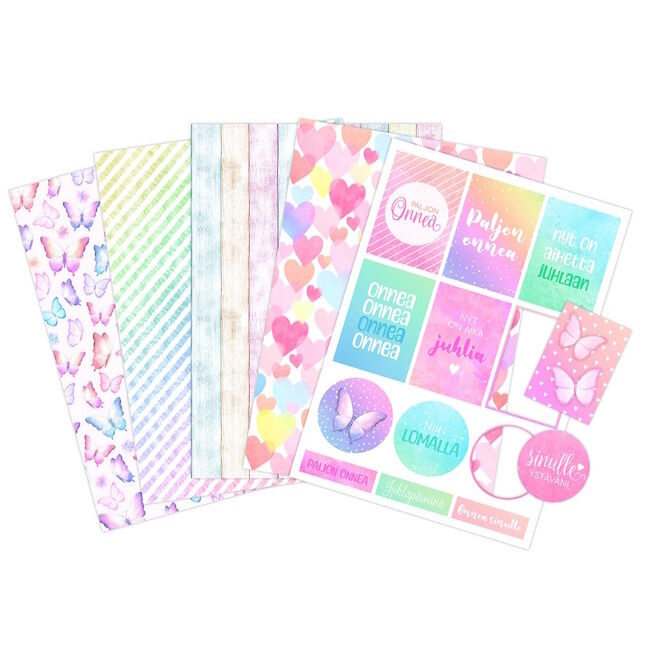 Kartonkilajitelma askarteluun ja koristeluun. Pakkaus sisältää kahdeksan arkkia A4-kokoisia kuviokartonkeja sekä kaksi A4-kokoista arkkia valmiiksi leikattuja kartonkisia tekstikuvioita. Pakkauksessa on neljä erilaista kuviokartonkia, kaksi kappaletta per kuosi.