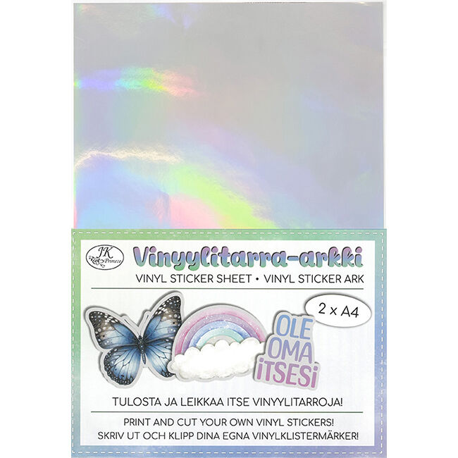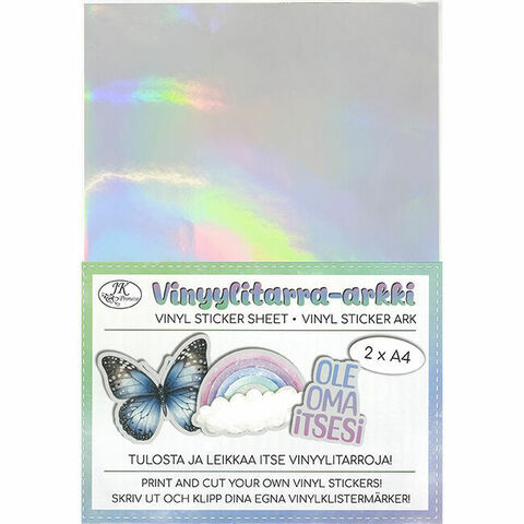 Vinyylitarrat askarteluun, koristeluun ja tulostukseen. Pakkaus sisältää kaksi A4-kokoista arkkia muovisia vinyylitarroja, joissa on hologrammipinta. Vinyylitarrat ovat kestäviä ja monikäyttöisiä. Voit tulostaa niihin haluamasi kuvan ja leikata haluamaasi muotoon. Vinyylitarrat sopivat esim. muistikirjojen, läppäreiden ja puhelimien koristeluun.