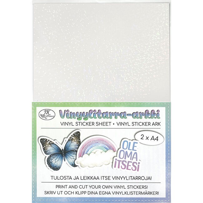 Vinyylitarrat askarteluun, koristeluun ja tulostukseen. Pakkaus sisältää kaksi A4-kokoista arkkia muovisia vinyylitarroja, joissa on hologrammipinta. Vinyylitarrat ovat kestäviä ja monikäyttöisiä. Voit tulostaa niihin haluamasi kuvan ja leikata haluamaasi muotoon. Vinyylitarrat sopivat esim. muistikirjojen, läppäreiden ja puhelimien koristeluun.