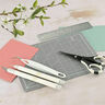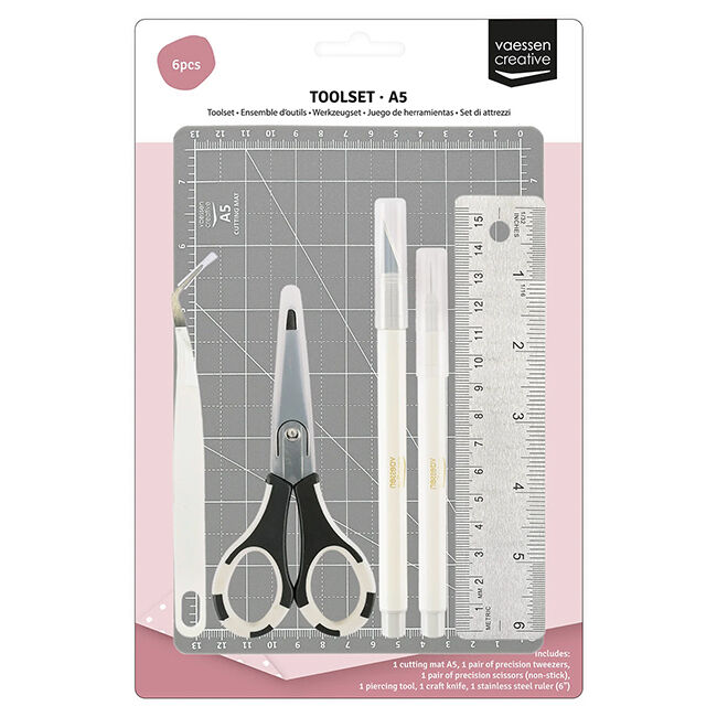 Leikkausmatto suojaa työtasoasi ja pitää työkalusi terävinä pidempään. Ruostumattomasta teräksestä valmistettu viivain helpottaa tarkkaa mittaamista ja suoraa leikkaamista. Askarteluveitsi ja tarkkuussakset leikkaavat tasaisesti ja siististi, kun taas pinsetit ja lävistystyökalu tarjoavat maksimaalisen hallinnan hienoimpien yksityiskohtien työstämiseen. Kompaktin A5-koon ansiosta voit helposti ottaa työkalusarjan mukaasi ja työskennellä missä tahansa.