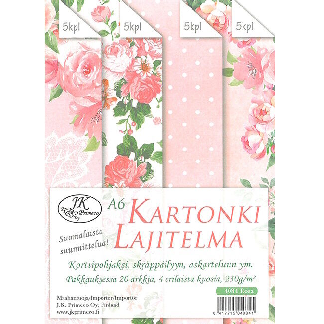 Kartonkilajitelma askarteluun ja koristeluun. Pakkaus sisältää yhteensä 20 arkkia A6-kokoista kuvioitua kartonkia, joissa on neljä eri kuosia. Yhtä kuosia on 5 kappaletta per paketti.