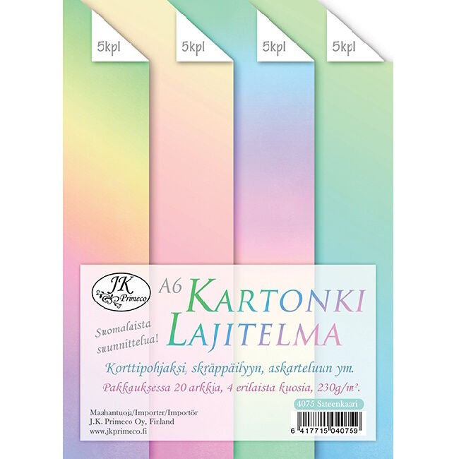 A6-kokoinen kartonkilajitelma askarteluun ja koristeluun. Sopii myös suoraan korttipohjaksi.