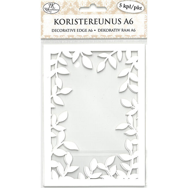 Koristereunukset askarteluun ja koristeluun. Pakkaus sisältää viisi kappaletta A6-kokoisia kartonkisia reunuksia, joissa on laserleikattu kuviointi. Koristereunus sopii A6-kokoisen korttipohjan päälle, jolloin korttipohja näkyy laserleikatun kuvion läpi.