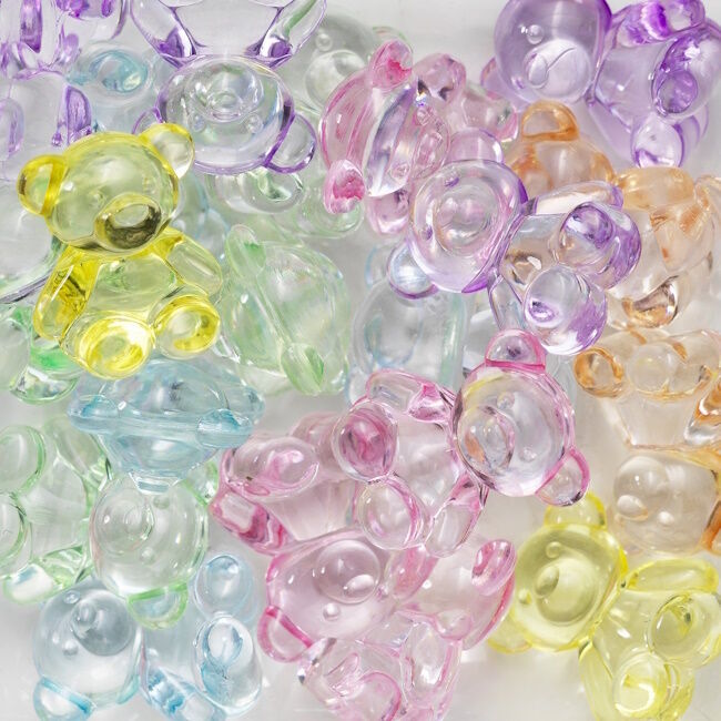 Nallehelmet - ainoa asia, joka ei ole makea näissä karhuissa, on maku, joten pidä ne poissa karkkikulhosta! Pakkaus sisältää 20 helmeä hieman vaihtuvien läpinäkyvien nallekarhujen muodossa 3 eri värissä. Jokainen karhu on kooltaan 15×10×18 mm ja sen sivulla on 2,5 mm leveä reikä. 3-vuotiaasta alkaen.