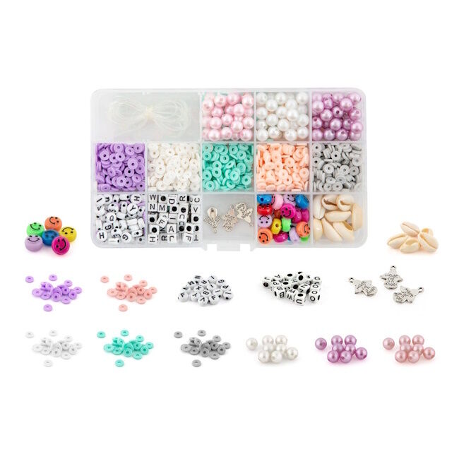 Helmilajitelma jossa mm. litteitä heishi-helmiä, pyöreitä helmia, riipuksia ja kirjainhelmiä.