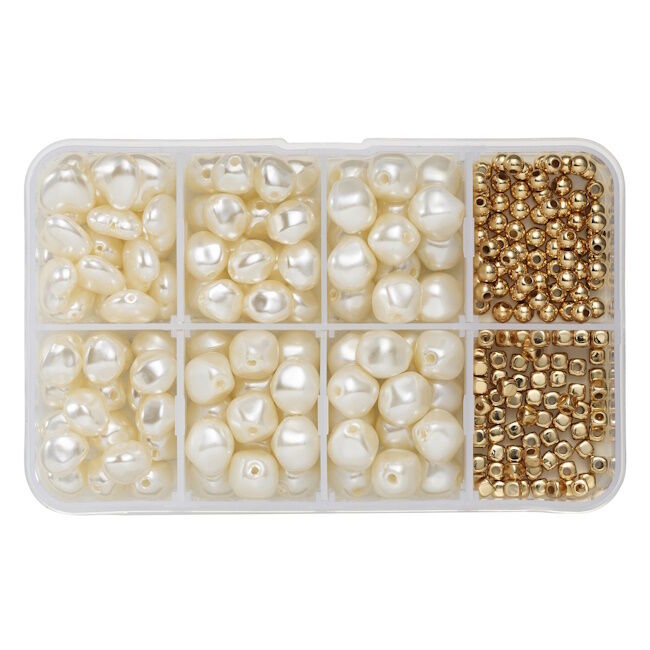 Akryylihelmisekoitus on mukava sekoitus helmiä niille, jotka nauttivat klassisesta makeanveden helmien ja kullan sekoituksesta korujen valmistuksessa - mutta eivät halua kuluttaa omaisuuttaan! 1920-luvun hehku ja loisto ei ole koskaan ollut helpompaa. Seoksessa on noin 100 valkoista kiiltävää akryylihelmeä, jotka ovat epäsäännöllisen muotoisia ja kokoisia sekä sydämenmuotoisia - halkaisija 0,7-1,0 cm, reiän halkaisija 1 mm. Kultaisia akryylihelmiä on kahta lajiketta – pyöreitä ja neliömäisiä, noin 70 kappaletta kutakin – halkaisija 2,5 mm, reiän halkaisija 1 mm.