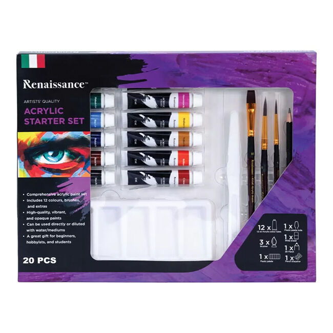 Renaissance akryylimaalauksen aloituspakkaus sisältää 12 väriä, maalauspaletin ja -veitsen sekä kolme sivellintä, lyijykynän ja teroittimen.