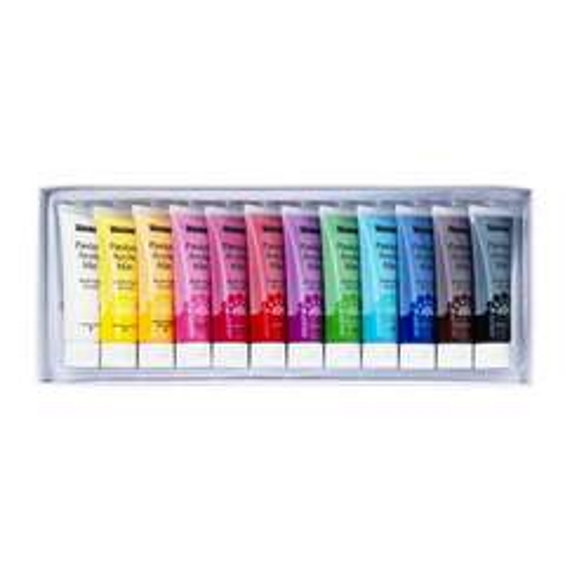 12 väriä. - Väri: Titanium White, Primary Yellow, Medium Yellow, Vermillion, Primary Magenta, Azo Pink, Vivid Violet, Primary cyan, Royal Blue, Dark Cadmium Green Hue, Burnt Umber & Mars Black.