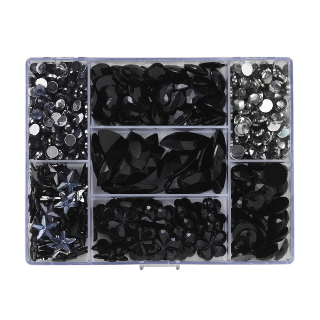 Koristekivet, akryylia, litteä selkä. Kimaltelevia mustia koristekiviä eri muodoissa (tähdet, ympyrät, sydämet, kukat ja soikeat) 3-25 mm. Pakkaus 600 kpl.