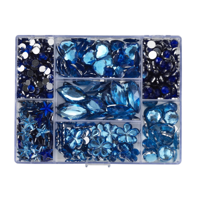 Koristekivet, akryylia, litteä selkä. Kimaltelevia sinisiä koristekiviä eri muodoissa (tähdet, ympyrät, sydämet, kukat ja soikeat) 3-25 mm. Pakkaus 600 kpl.