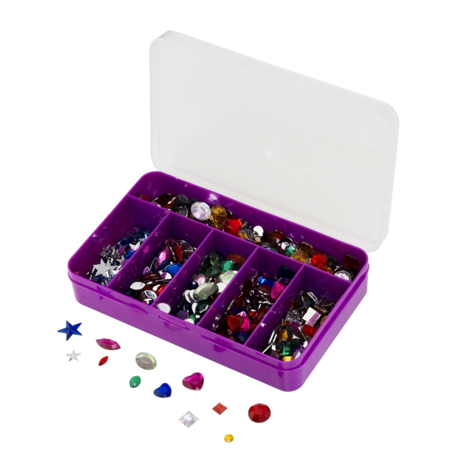 Sekoitus akryylistä valmistettuja koristekiviä. Litteä selkä. Eri lajikkeita Ø 5 mm - 10x14 mm. Laatikko 9x14,5 cm / 6 osastoa. Pakkaus noin 1000 kpl