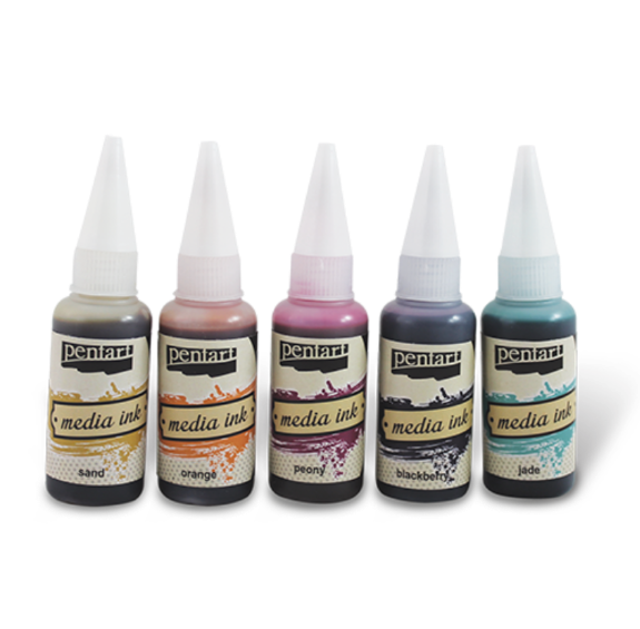 Media Inkit ovat nopeasti kuivuvia ja happovapaita alkoholimusteita, joiden kanssa voit leikkiä väreillä. Voit sekoittaa värejä keskenään ja kerrostaa niitä. Värit ovat parhaimmillaan kiiltävä- ja satiinipintaisilla tai synteettisillä papereilla. Voit käyttää värejä myös muihin pintoihin kuten posliiniin, lasiin, metalliin, muoviin, kankaaseen, silkkiin ja puuhun.