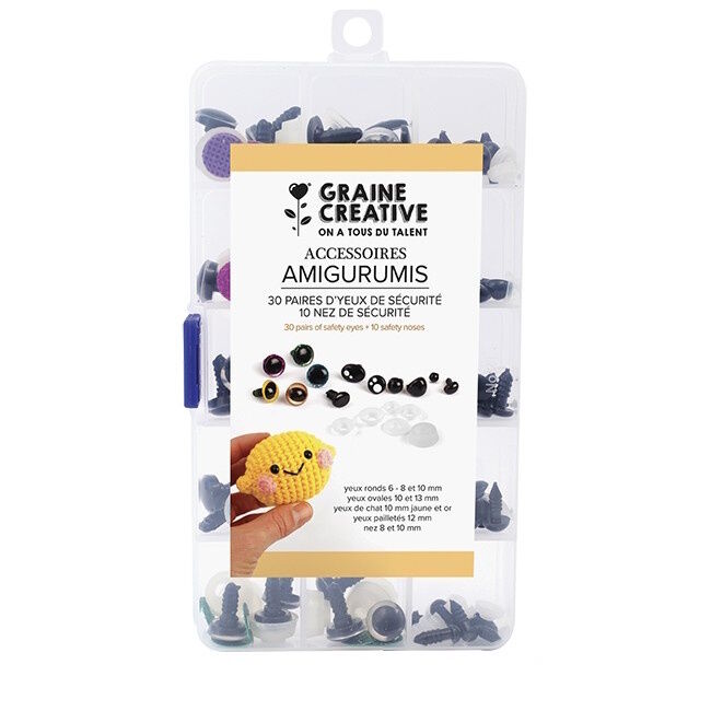 Herätä Amigurumi-figuurisi henkiin oikeilla lisävarusteilla! Sarja sisältää yhteensä 30 eri kokoista, muotoista ja väristä silmää (pyöreä 6+8 mm, soikea 10+12 mm, kawaii 10 mm, kissansilmät 10 mm, kimaltelevat silmät 10 mm), sekä 2 nenäkokoa.