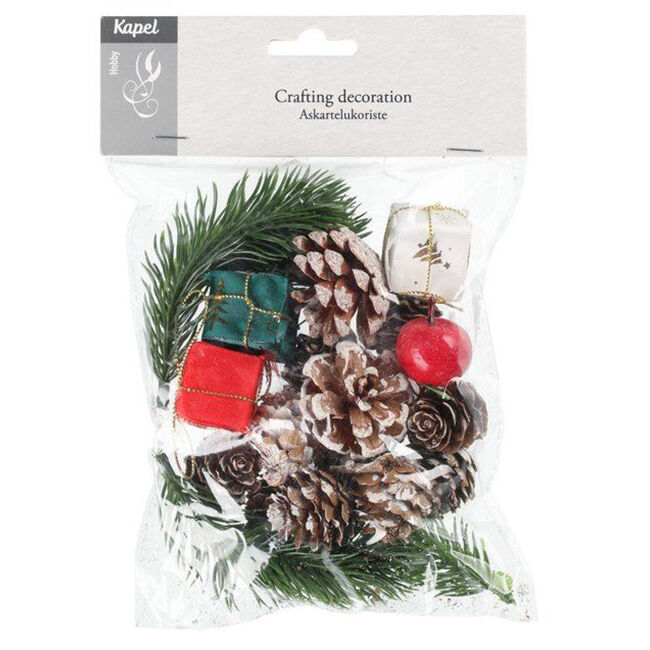 Pakkaus sisältää mm. käpyjä, lahjapaketteja, kuusen neulasia ja sieniä, joilla voi koristella esimerkiksi jouluisen kukka-asetelman.