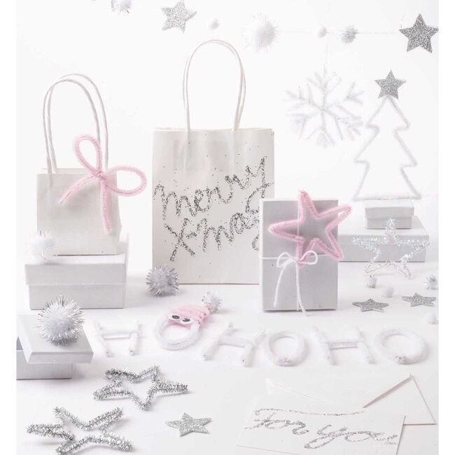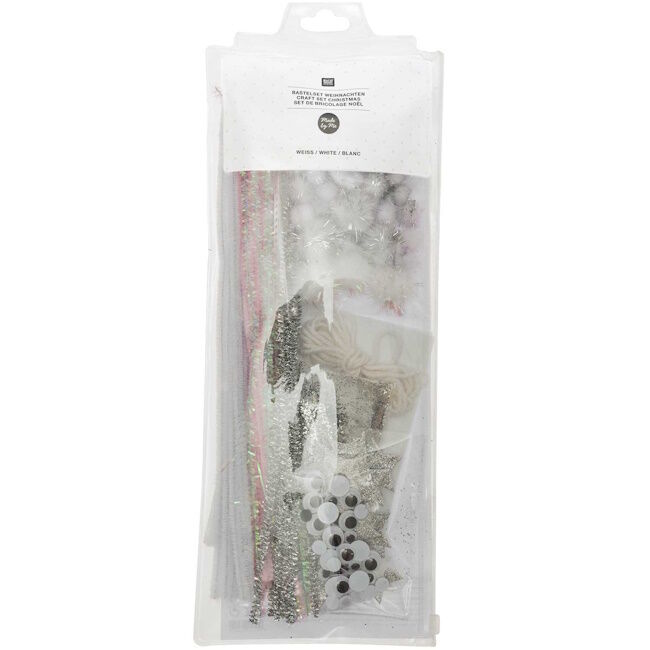 Mukana on kaikki mitä tarvitset upeiden askarteluideoiden toteuttamiseen chenillelangoista, pompomeista kimalteleviin vaahtomuovitähtiin, huopaan, villanaruihin ja googly-silmiin. Askartelusetti sisältää jouluväriyhdistelmiä valkoisen, hopean ja vaaleanpunaisen sävyissä.