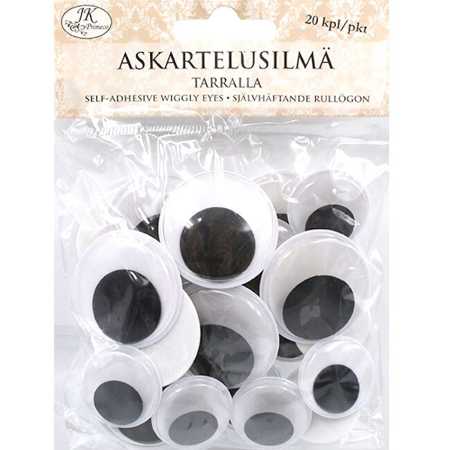 Pakkauksessa 20 askartelusilmää, 2 eri kokoa (2,5cm ja 3,5cm).
