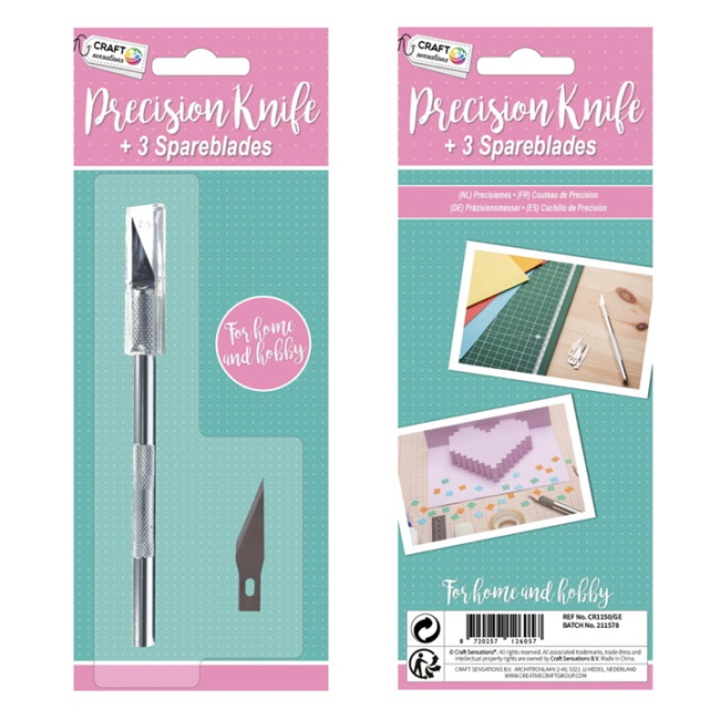 Metallivarsinen askarteluveitsi korkilla ja varaterillä.
