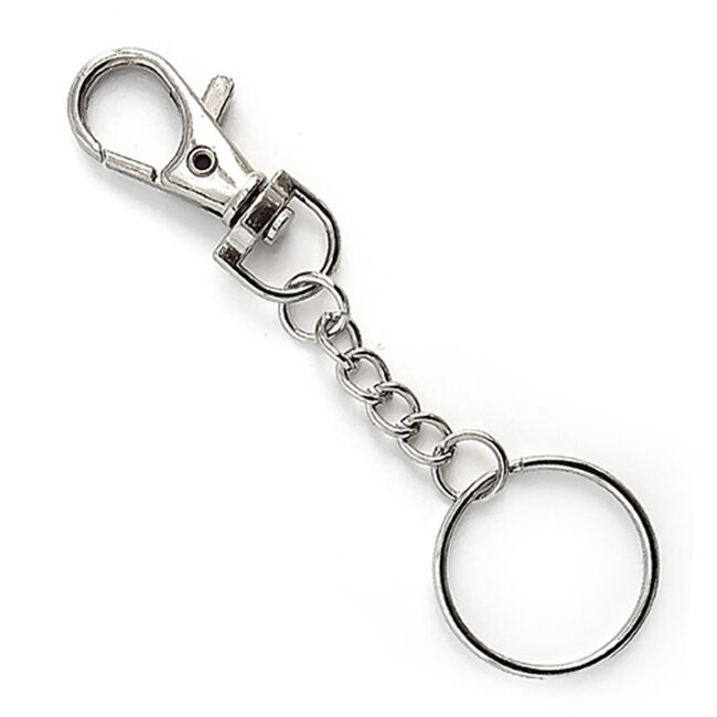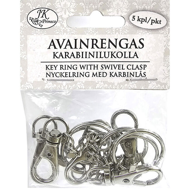 Nikkelitön avainrengas karabiinilukolla askarteluun ja korujen valmistukseen. Pakkaus sisältää viisi kappaletta metallisia avainrenkaita, joissa on ketju ja karabiinilukko.