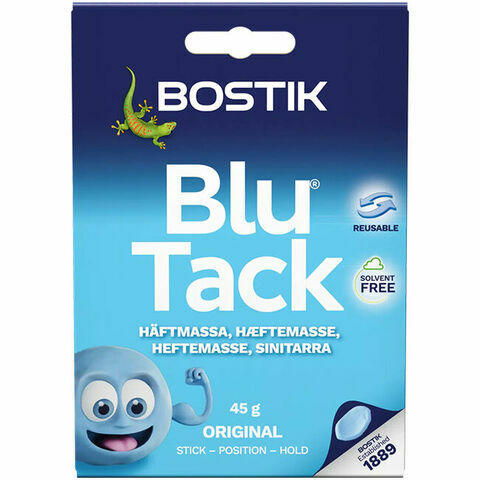 Blu Tack® on uudelleenkäytettävä, myrkytön ja helppokäyttöinen kiinnitysmassa, joka toimii erinomaisena vaihtoehtona teipille ja nastoille. Se soveltuu erityisesti ei‑huokoisille pinnoille, kuten maalatuille pinnoille, lasille ja metallille. Blu Tack® tarjoaa välittömän ja uudelleen sijoitettavan kiinnityksen ja sillä on lukuisia käyttökohteita kotona, toimistossa ja koulussa. Soveltuu esimerkiksi esineiden kiinnittämiseen, suoristamiseen ja väliaikaiseen tukemiseen. Kiinnitysmassa on helppo muotoilla ja käyttää, ja se voidaan irrottaa ja käyttää uudelleen useita kertoja. Tuote on liuotinvapaa ja turvallinen. Blu Tack® sinitarraa on valmistettu Britanniassa jo yli 50 vuoden ajan