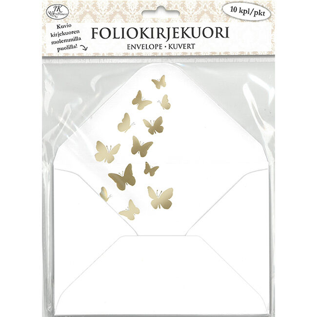 Foliokirjekuori askarteluun. Pakkaus sisältää 10 kappaletta C6-kokoisia kuvioituja kirjekuoria, joissa on kostutettava liimaläppä. Kirjekuorissa on kultainen foliopainatus sisä- ja ulkopuolella.