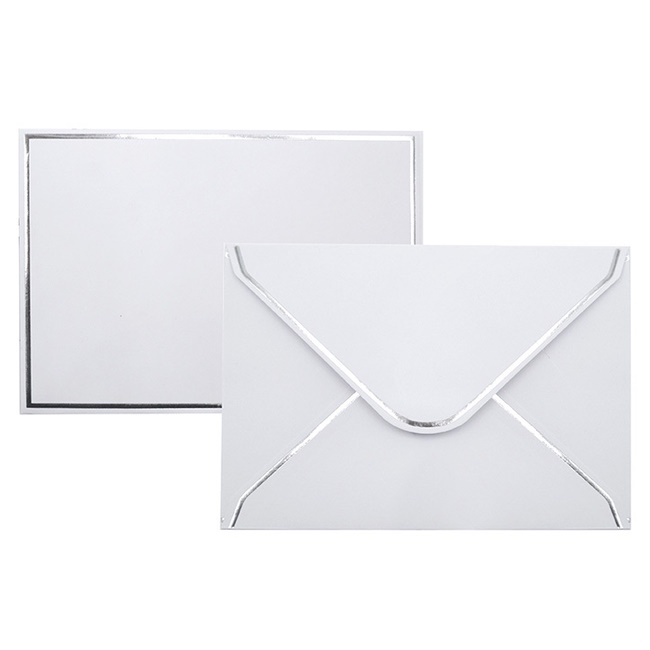 C6 kirjekuori kostutettavalla liimaläpällä, 120g. Kirjekuoressa hopeinen foliopainatus.