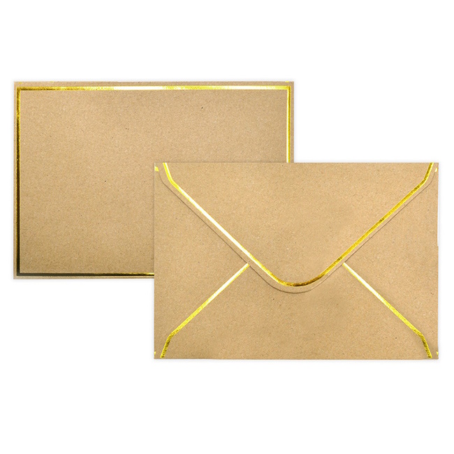 C6 kirjekuori kostutettavalla liimaläpällä, 120g. Kirjekuoressa kultainen foliopainatus.