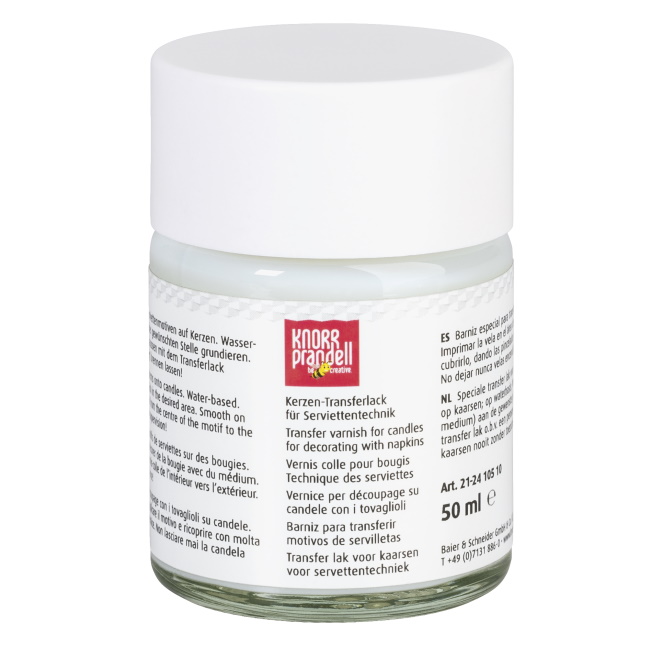 Läpinäkyvä decoupagelakka kynttilöiden koristeluun.