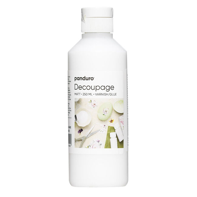 Decoupagelakka mattapinta. Lakka on vesipohjainen ja toimii sekä lakkana että liimana paperille, pahville ja puulle jne. Muunna tylsä jakkara tyylikkääksi huonekaluksi suosikkilehtesi aiheilla, tyylikkäillä paperiarkeilla tai lautasliinoilla. Voitko leikata sitä? Sitten voit kiinnittää sen esineisiin decoupagelakalla! Valmistele kuviot lakkaa esine, johon ne levitetään, ja aloita koristelu. Lakkaa sitten esine uudelleen.