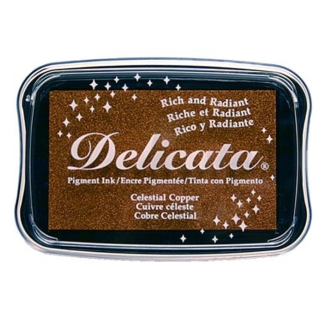 Iso Delicata mustetyyny. Syvä ja säteilevä väri. Hieno metallinen pigmenttimuste. Hapoton. Vesipohjainen. Arkistokelpoinen. Hieno metallimuste, joka ei tummu tai menetä kiiltoaan. Delicata pigmenttimuste kuivuu muutamassa minuutissa huokoiselle paperille. Delicata ei sovellu kohokuviointiin, koska se kuivuu nopeasti.