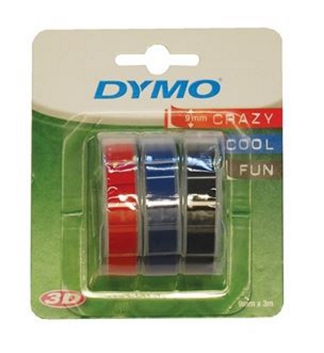 Dymo kohokirjoitinnauha, punainen, sininen ja musta, 9 mm x 3 m.