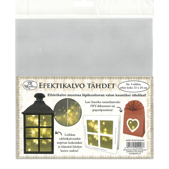Efektikalvo muuttaa läpikuultavan valon kauniiksi tähdiksi! Leikkaa kalvosta sopivan kokoinen pala ja käytä lyhdyn lasien päällä tai koristeikkunan kanssa.