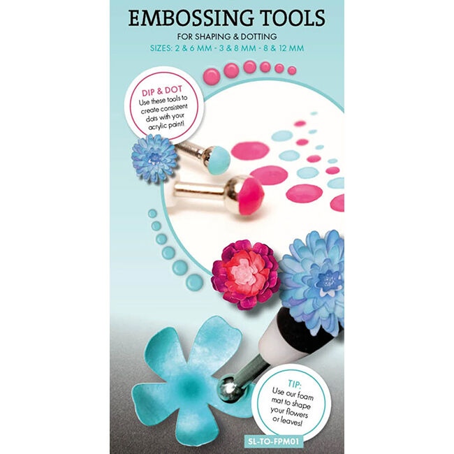 Kohokuviointityökalu on kätevä korttien valmistuksessa. Posliinin koristeluun käytetään myös embossausta. Posliinista pistelytekniikkaa varten tee erikokoisia pisteitä yksinkertaisesti maalilla. Tämä kohokuviointityökalusarja sisältää embossauskyniä seuraavissa koossa: 2-6 mm, 3-8 mm ja 8-12 mm.