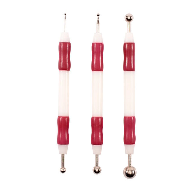 Kohokuviointityökalu on kätevä korttien valmistuksessa. Posliinin koristeluun käytetään myös embossausta. Posliinista pistelytekniikkaa varten tee erikokoisia pisteitä yksinkertaisesti maalilla. Tämä kohokuviointityökalusarja sisältää embossauskyniä seuraavissa koossa: 2-6 mm, 3-8 mm ja 8-12 mm.