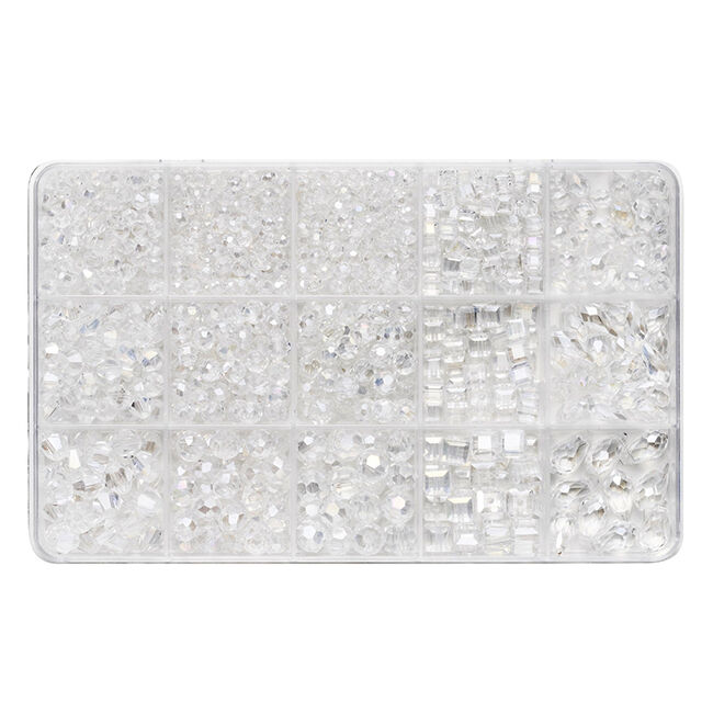 Pakkaus sisältää pyöreitä helmiä, joissa on paljon kauniita hiontoja, jotka heijastavat valoa. Sama pätee neliönmuotoisiin, pyöreäreunaisiin helmiin ja pisaranmuotoisiin helmiin. Koko vaihtelee pyöreiden helmien Ø4–7 mm:n, neliönmuotoisten helmien 4–8 mm:n sivujen pituuden ja pisaranmuotoisten helmien Ø4–8 mm / 9–13 mm:n pituuden välillä.