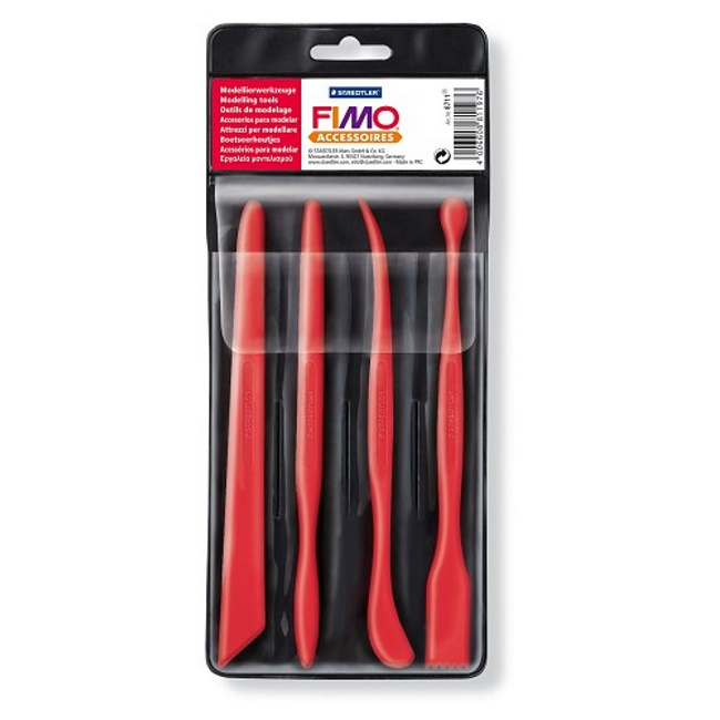 FIMO® MUOTOILUTYÖKALUT 8711. Lisävaruste, joka soveltuu erityisesti käytettäväksi FIMOn kanssa. Täydellinen lisävaruste muovailumassojen kanssa työskentelyyn ja vaikuttavien viimeistelyjen lisäämiseen. 4 erilaista työkalua.