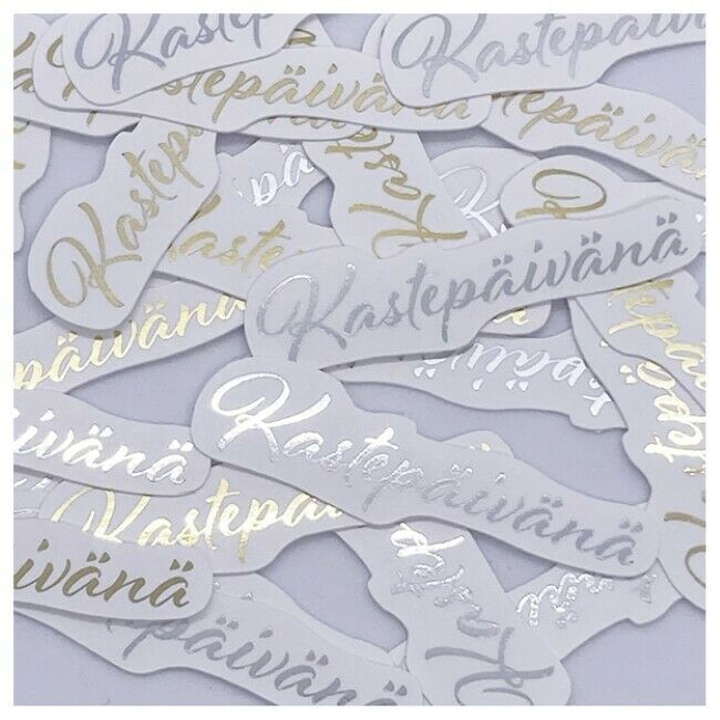 Pakkaus sisältää 20 kartonkista tekstileikettä, puolet hopeafolioituna ja puolet kultafolioituna.