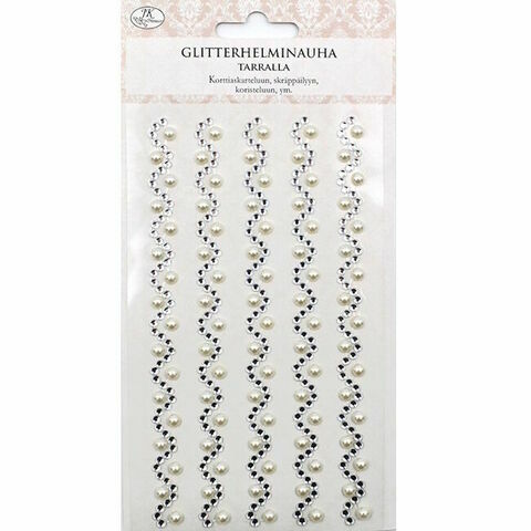 Glitterhelmitarranauha askarteluun ja koristeluun. Pakkaus sisältää viisi muovista glitterhelminauhaa, joissa on tarra takana.