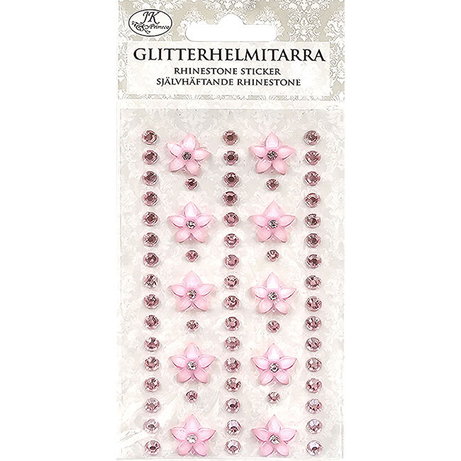 Glitterhelmitarralajitelma askarteluun ja koristeluun. Pakkaus sisältää yhden arkin glitterhelmi- ja hartsikukkatarroja.