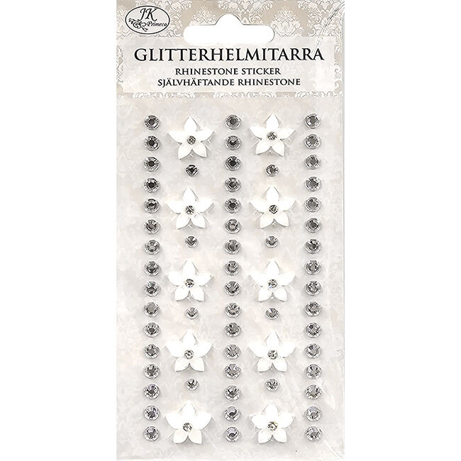 Glitterhelmitarralajitelma askarteluun ja koristeluun. Pakkaus sisältää yhden arkin glitterhelmi- ja hartsikukkatarroja.